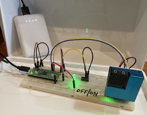 Sound Lab | Air Quality Sensor[ Projects ] [ Workshop Resources ] [ Workshop Photos ] [ theoryofpaul.net homepage ] This project utilized an Adafruit Adafruit PMSA003I Air Quality Breakout, a Raspberry Pi Pico, and a switch and an LED. The Pico was powered by a small external USB battery (the type used to charge phones).