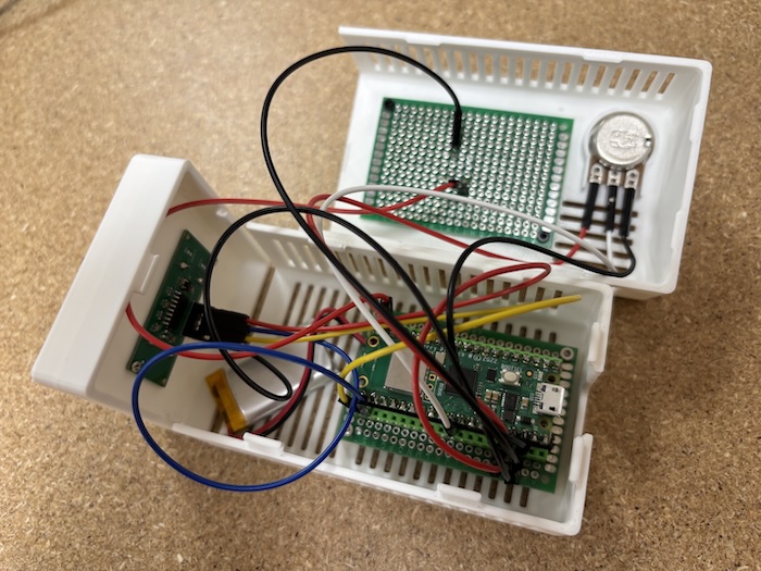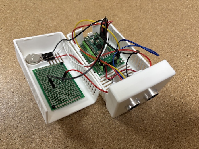 The Pico runs a Python script which collects distance information and formats it in centimeters. It also reads the potentiometer (main volume control) and button state. It then formats all of this as an OSC message and sends the data through UDP to the local WiFi network. A computer or laptop on the same WiFi network can read this data in Pd. The button cycles through simple patches students create in Pd that do anything with a single variable in the audio domain. Controller -- Rev1 (September 2025)