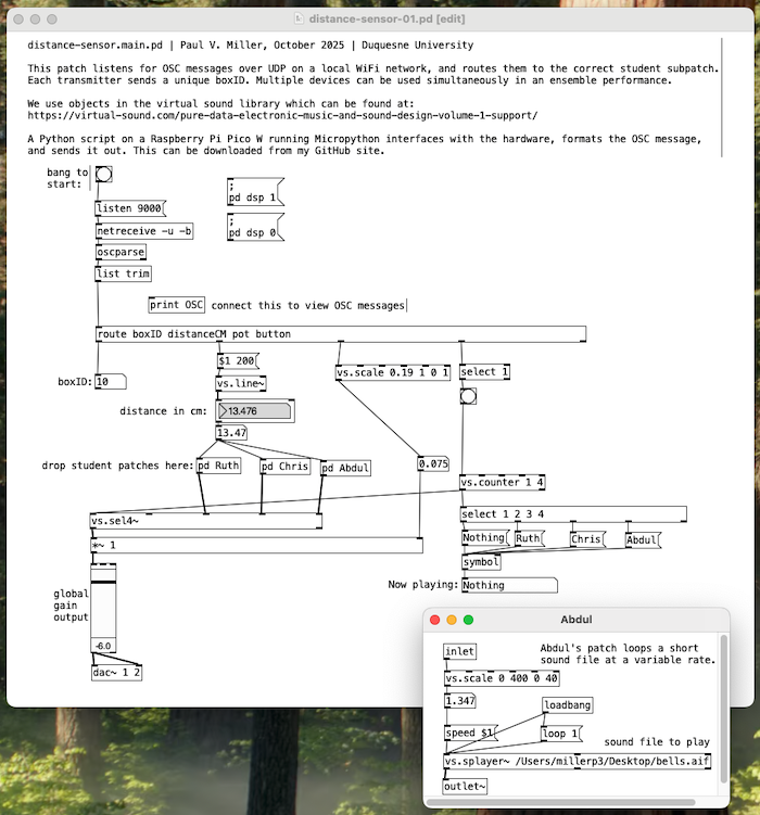 Sound Lab | Distance Sensor[ Projects ] [ Workshop Resources ] [ Workshop Photos ] [ theoryofpaul.net homepage ] This project cycles through patches that beginning students create. The student patches take one input variable (distance in cm) and do anything with it in the sound domain. The patches are all in a Pd "main" patch that resides on a laptop or computer on the same WiFi network as the controller. The materials include: