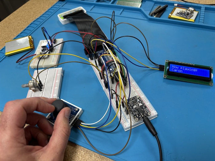 The Pi Zero runs a standard installation of Debian Linux, with Pd (Pure Data) running on the board itself. A Python script sends joystick and potentiometer data via OSC to Pd; in turn it receives a string variable -- the name of the student's patch -- and sends it out to the LCD screen. The joystick button cycles through students' patches, which all take two variables (x and y position of the joystick) and do anything with them in the audio domain. Adding student patches to the main patch is extremely easy since they are all simply subpatches within the main patch. The joystick button just increments a counter, which routes data through each subpatch in turn. Then the audio gets sent to the UDA1334a (which is configured as an audio output device in /boot/firmware/config,) and the student's name gets sent via OSC out to the Python patch (which in turn formats it and sends it to the LCD screen). We are currently working on constructing a PCB board so we can mount all the components, connect them, and house them in a 3D printed enclosure easily. Content on this page is licenced under GNU General Public License.  |