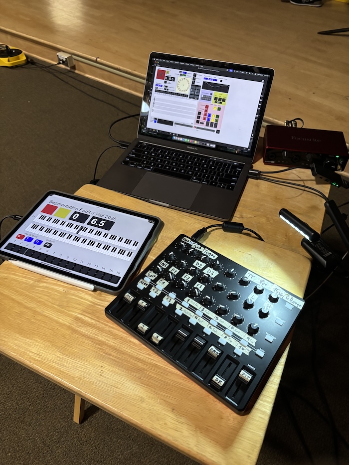 Sound Lab | Performance | Segmentation Fault[ Projects ] [ Workshop Resources ] [ Workshop Photos ] [ theoryofpaul.net homepage ] Paul Miller premiered this project in October 2025. It's a Max/MSP patch with live rendered 3D video. I used a sequencer driven by some low-frequency FM synthesis to produce values that were then scaled to MIDI notes within a movable window. The piece was controlled by an iPad running MIRA and an Akai MidiMix controller. The piece was in three sections, with a surprise ending.