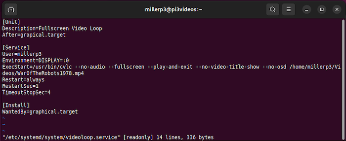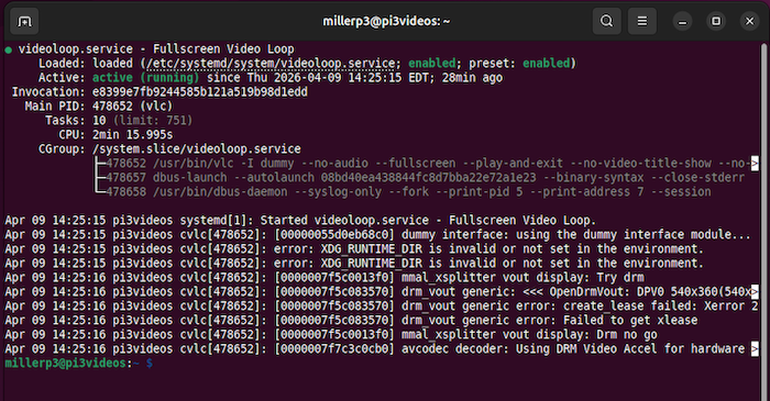 I wrote a simple systemd service so that I can loop videos continuously by running videoloop.service.